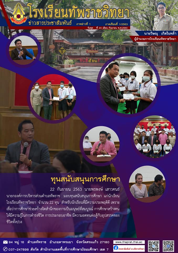 22 กันยายน 2563 นายพรพงษ์ เสาวคนธ์ นายกองค์การบริหารส่วนตำบลทัพราช มอบทุนสนับสนุนการศึกษา แก่นักเรียนโรงเรียนทัพราชวิทยา จำนวน22 ทุน สำหรับนักเรียนที่มีความประพฤติดี เพราะเชื่อว่าการศึกษาช่วยสร้างจิตส