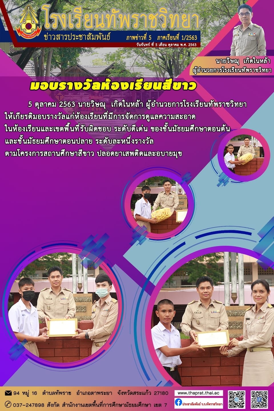 นายวิษณุ เกิดในหล้า ผู้อำนวยการโรงเรียนทัพราชวิทยา ให้เกียรติมอบรางวัลแก่ห้องเรียนที่จัดการด้านความสะอาดของห้องเรียนและเขตพื้นที่ ระดับดีเด่น ทั้งระดับ มัธยมศึกษาตอนต้น และมัธยมศึกษาตอนปลาย