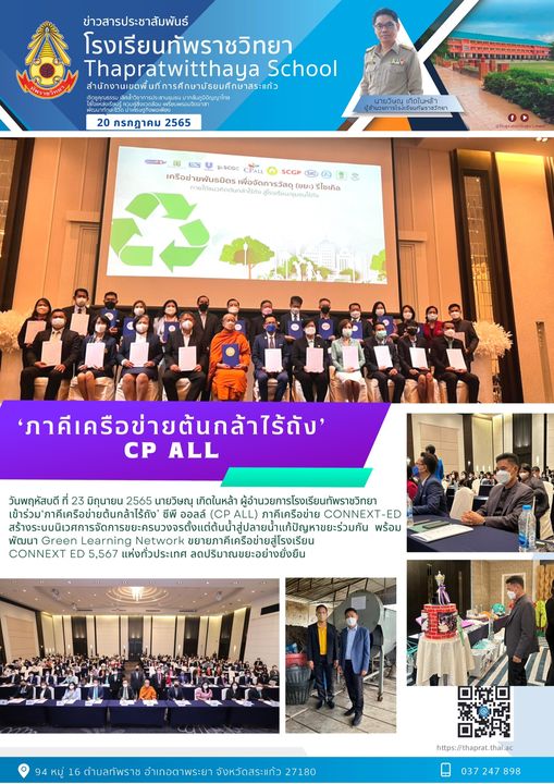 วันพฤหัสบดี ที่ 23 มิถุนายน 2565 นายวิษณุ เกิดในหล้า ผู้อำนวยการโรงเรียนทัพราชวิทยา เข้าร่วม‘ภาคีเครือข่ายต้นกล้าไร้ถัง’ ซีพี ออลล์ (CP ALL) ภาคีเครือข่าย CONNEXT-ED สร้างระบบนิเวศการจัดการขยะครบวงจรตั้งแต่ต้นน้ำสู่ปลายน้ำแก้ปัญหาขยะร่วมกัน พร้อมพัฒนา Green Learning Network ขยายภาคีเครือข่ายสู่โรงเรียน