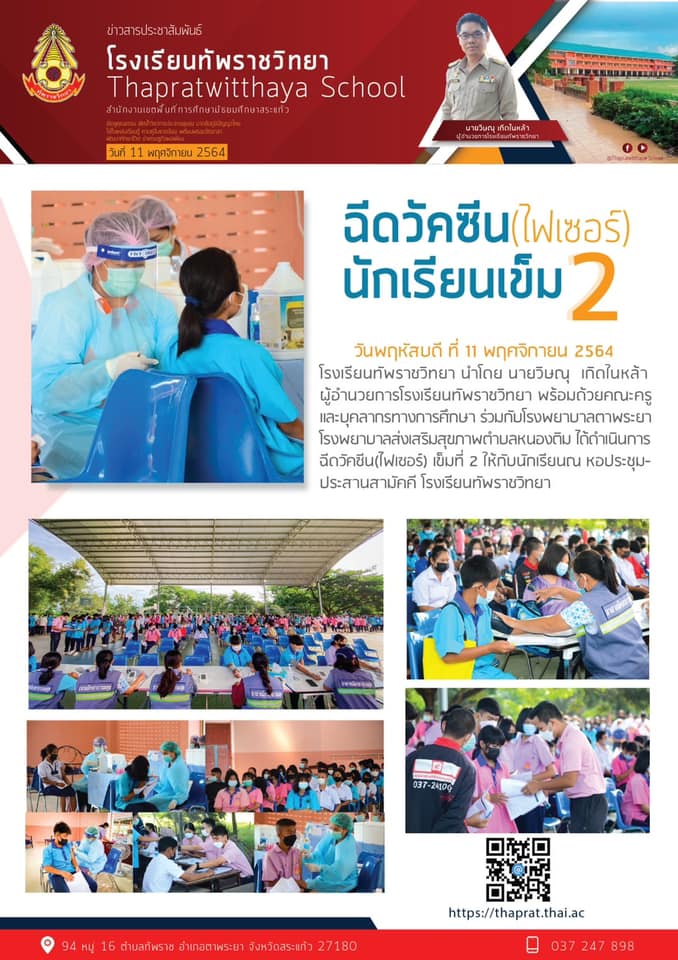 ฉีดวัคซีน (ไฟเซอร์) เข็มที่ 2 -------------------------------------- วันพฤหัสบดี ที่ 11 พฤศจิกายน 2564 โรงเรียนทัพราชวิทยา นำโดย นายวิษณุ เกิดในหล้า ผู้อำนวยการโรงเรียนทัพราชวิทยา พร้อมด้วยคณะครู