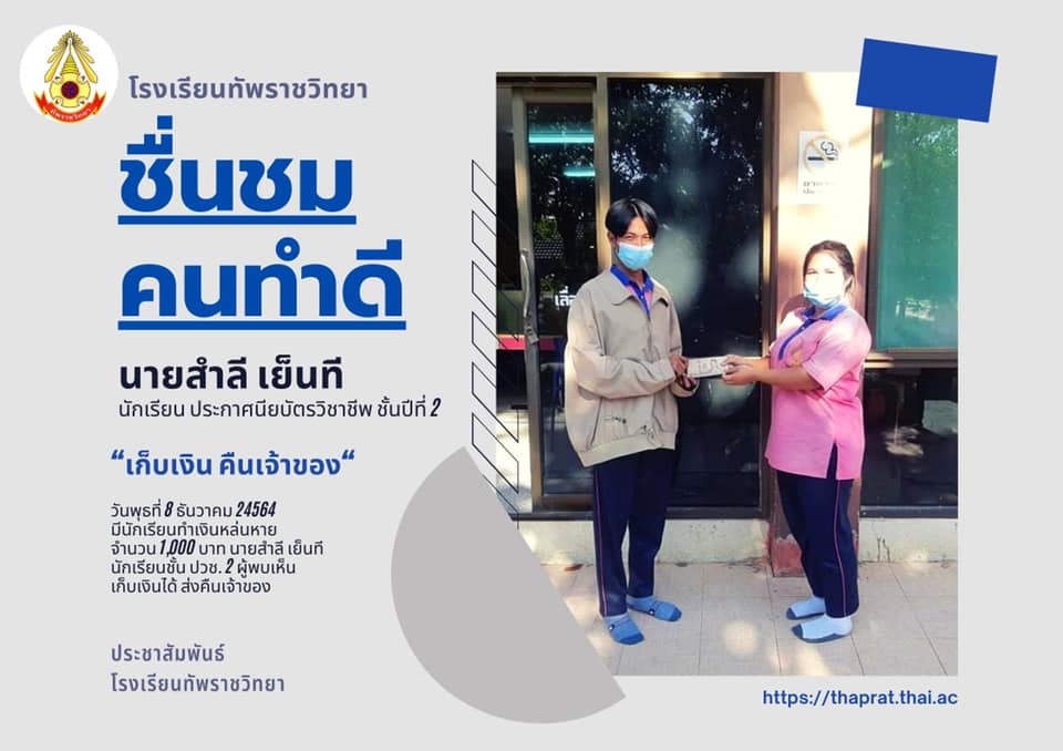?ชื่ น ช ม ค น ทำ ดี? ???????????? นายสำลี เย็นที นักเรียนประกาศนียบัตรวิชาชีพ ชั้นปีที่ 2 ?เก็บเงิน ส่งคืนเจ้าของ? ? วัน พุธที่ 8 ธันวาคม 24564 มีนักเรียนทำเงินหล่นหาย จำนวน 1,000 บาท นายสำลี เย็นท