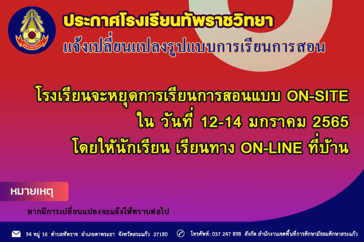 ประกาศโรงเรียนทัพราชวิทยา แจ้งเปลี่ยนแปลงรูปแบบการเรียนการสอน แบบ ON- SITE โดยให้นักเรียน เรียนทาง ON-LINE ที่บ้าน ในวันที่ 12-14 มกราคม 2565 โดยให้นักเรียนยึดตารางเรียนออนไลน์ 2/2564 หากมีการเปลี่ย
