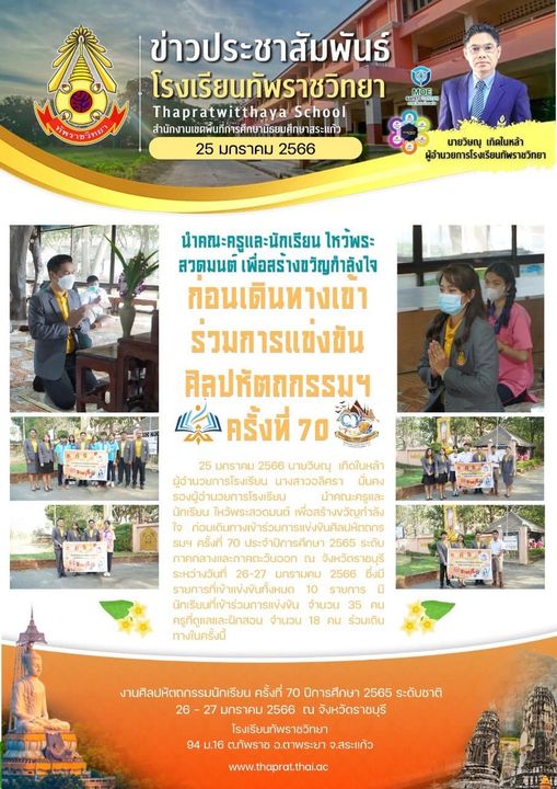 นำคณะครูและนักเรียนไหว้พระสวดมนต์เพื่อสร้างขวัญและกำลังใจ ก่อนเดินทางเข้าร่วมการแข่งขันงานศิลปหัถตกรรมครั้งที่ 70 จังหวัดราชบุรี