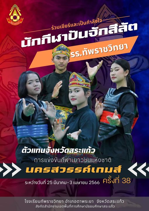 ร่วมเชียร์และให้กำลังใจนักกีฬาปันจักสีลัต ????????????? โรงเรียนทัพราชวิทยา ตัวแทนจังหวัดสระแก้ว ในการแข่งขันกีฬาปันจักสีลัต กีฬาเยาวชนแห่งชาติ ครั้งที่ 38 นครสวรรค์เกมส์ ระหว่างวันที่ 25 มีนาคม -