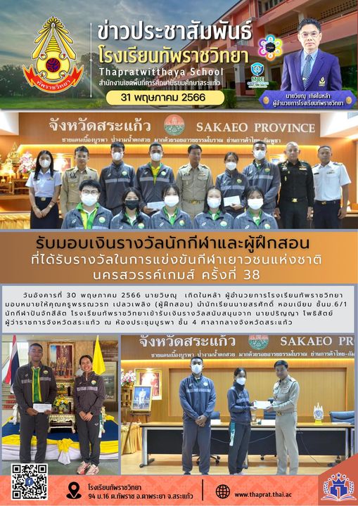 วันอังคารที่ 30 พฤษภาคม 2566 นายวิษณุ เกิดในหล้า ผู้อำนวยการโรงเรียนทัพราชวิทยา มอบหมายให้คุณครูพรรณวรท เปลวเพลิง (ผู้ฝึกสอน) นำนักเรียนนายสรศักดิ์ หอมเนียม ชั้นม.6/1 นักกีฬาปันจักสีลัต โรงเรียนทัพ