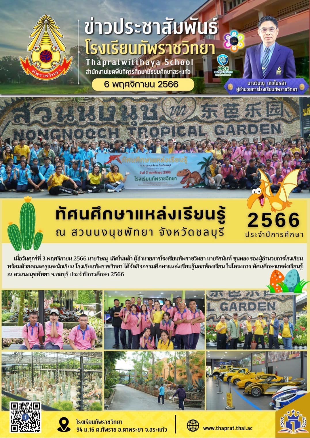 เมื่อ?วันที่ 3 พฤศจิกายน 2566 นายวิษณุ เกิดในหล้า ผู้อำนวยการโรงเรียนทัพราชวิทยา นายจิรนันท์ ขุนทอง รองผู้อำนวยการโรงเรียน พร้อมด้วยคณะครูและนักเรียนโรงเรียนทัพราชวิทยา ได้จัดกิจกรรมศึกษาแหล่งเรียนรู้นอกห้องเรียนในโครงการ ทัศนศึกษาแหล่งเรียนรู้ ณ สวนนงนุช จ.ชลบุรี ประจำปีการศึกษา 2566