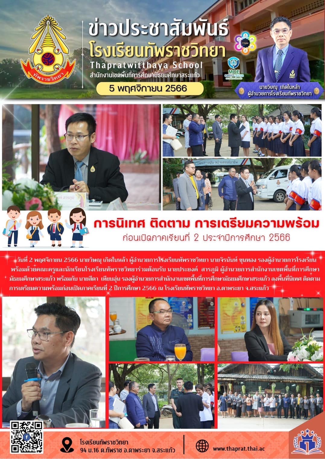 เมื่อ?วันที่ 2 พฤศจิกายน 2566 นายวิษณุ เกิดในหล้า ผู้อำนวยการโรงเรียนทัพราชวิทยา นายจิรนันท์ ขุนทอง รองผู้อำนวยการโรงเรียน พร้อมด้วยคณะครูและนักเรียนโรงเรียนทัพราชวิทยาร่วมต้อนรับ นายประยงค์ สารภูมิ ผู้อำนวยการสำนักงานเขตพื้นที่การศึกษามัธยมศึกษาสระแก้ว พร้อมกับ นายสีดา เทียบอุ่น รองผู้อำนวยการสำนักงานเขตพื้นที่การศึกษามัธยมศึกษาสระแก้ว ลงพื้นที่นิเทศติดตามการเตรียมความพร้อมก่อนเปิดภาคเรียนที่ 2 ปีการศึกษา 2566 ณ โรงเรียนทัพราชวิทยา อ.ตาพระยา จ.สระแก้ว
