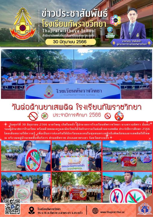 วันศุกร์ที่ 30 มิถุนายน 2566 นายวิษณุ เกิดในหล้า ผู้อำนวยการโรงเรียนทัพราชวิทยา นางสาวอลิศรา มั่นคง รองผู้อำนวยการโรงเรียน พร้อมด้วยคณะครูและนักเรียนได้จัดกิจกรรมวันต่อต้านยาเสพติด ประจำปีการศึกษา 25