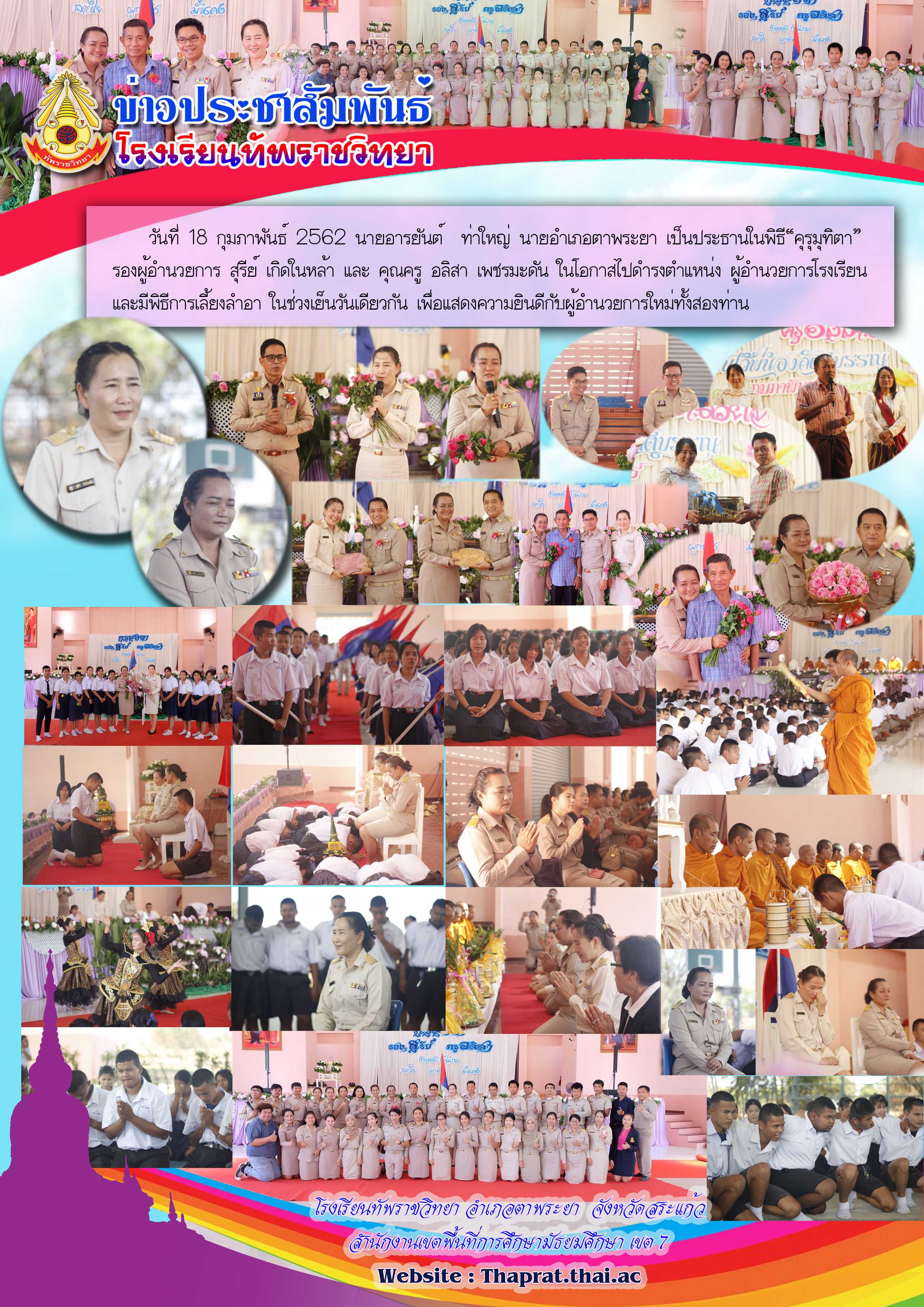 วันที่ 18 กุมภาพันธ์ 2562 นายอารยันต์ ท่าใหญ่ นายอำเภอตาพระยา เป็นประธานในพิธี?คุรุมุทิตา? รองผู้อำนวยการ สุรีย์ เกิดในหล้า และ คุณครู อลิสา เพชรมะดัน ในโอกาสไปดำรงตำแหน่ง ผู้อำนวยการโรงเรียน และ