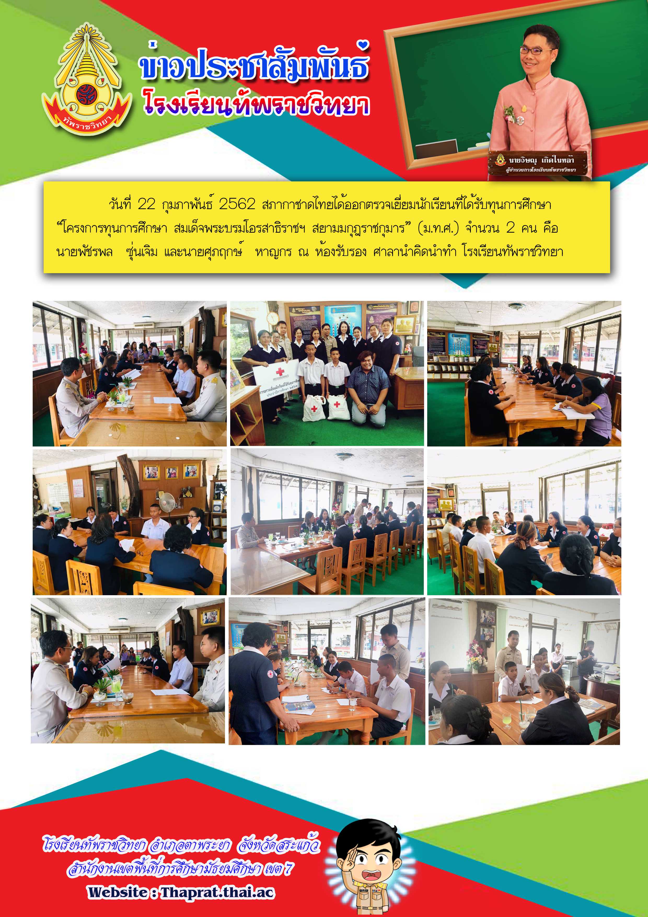 วันที่ 22 กุมภาพันธ์ 2562 สภากาชาดไทยได้ออกตรวจเยี่ยมนักเรียนที่ได้รับทุนการศึกษา ?โครงการทุนการศึกษา สมเด็จพระบรมโอรสาธิราชฯ สยามมกุฎราชกุมาร? (ม.ท.ศ.) จำนวน 2 คน คือ นายพัชรพล ซุ่นเจิม และนายศุภฤก
