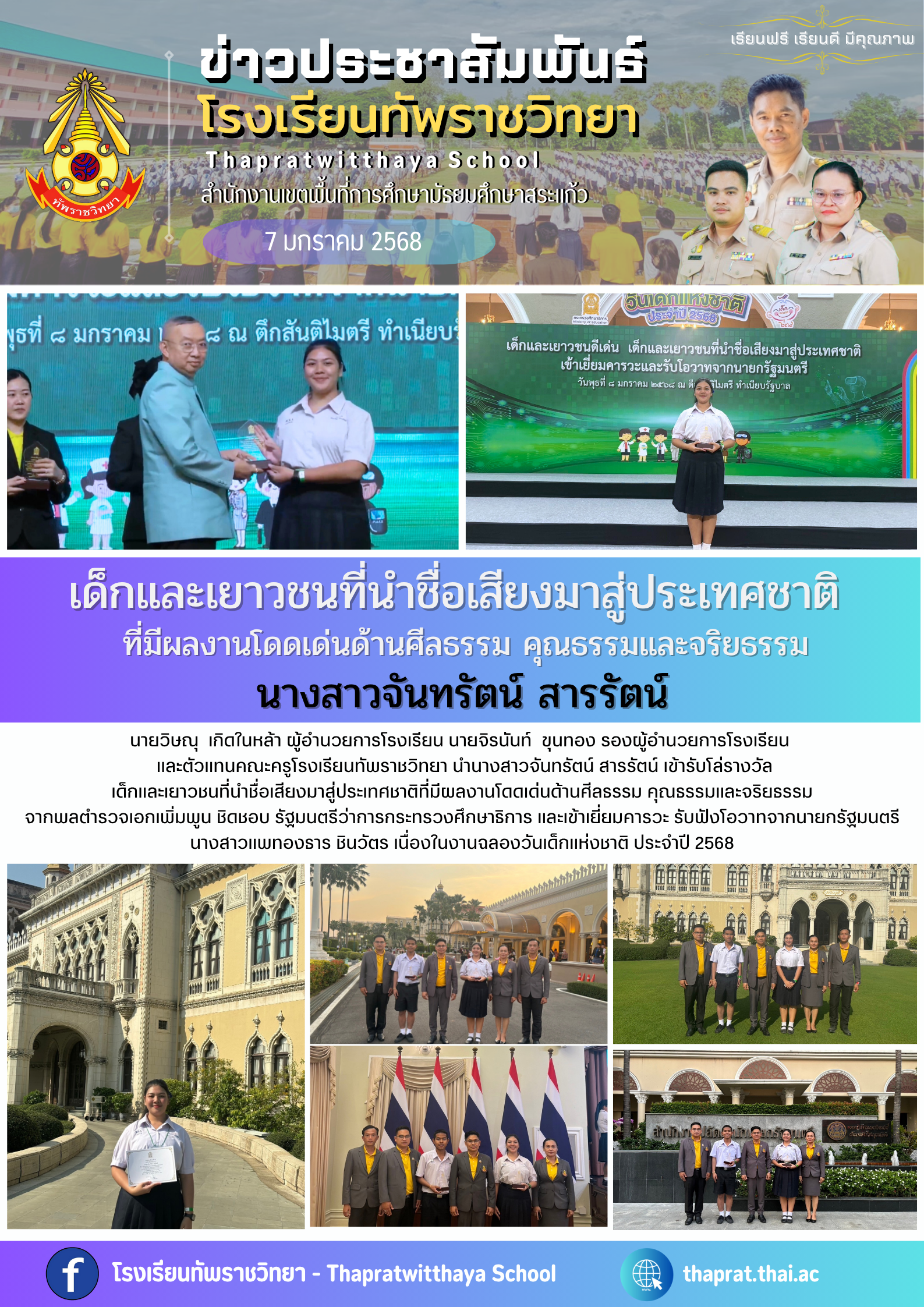 นางสาวจันทรัตน์ สารรัตน์ เข้ารับรางวัลเด็กที่นำชื่อเสีงมาสู่ประเทศชาติ ที่มีผลงานโดเด่นด้านศีลธรรม คุณธรรมและจริยธรรม