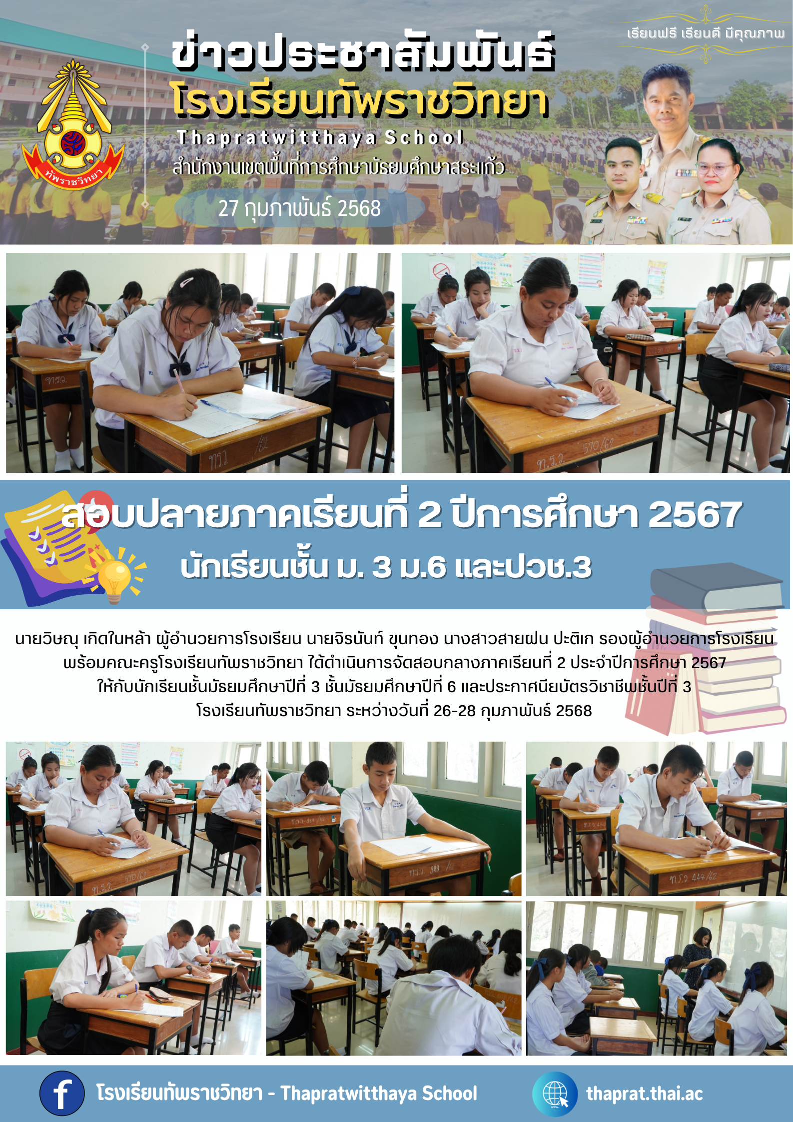 สอบปลายภาคเรียนที่ 2 ปีการศึกษา 2567 ม.3 ม.6 ปวช.3