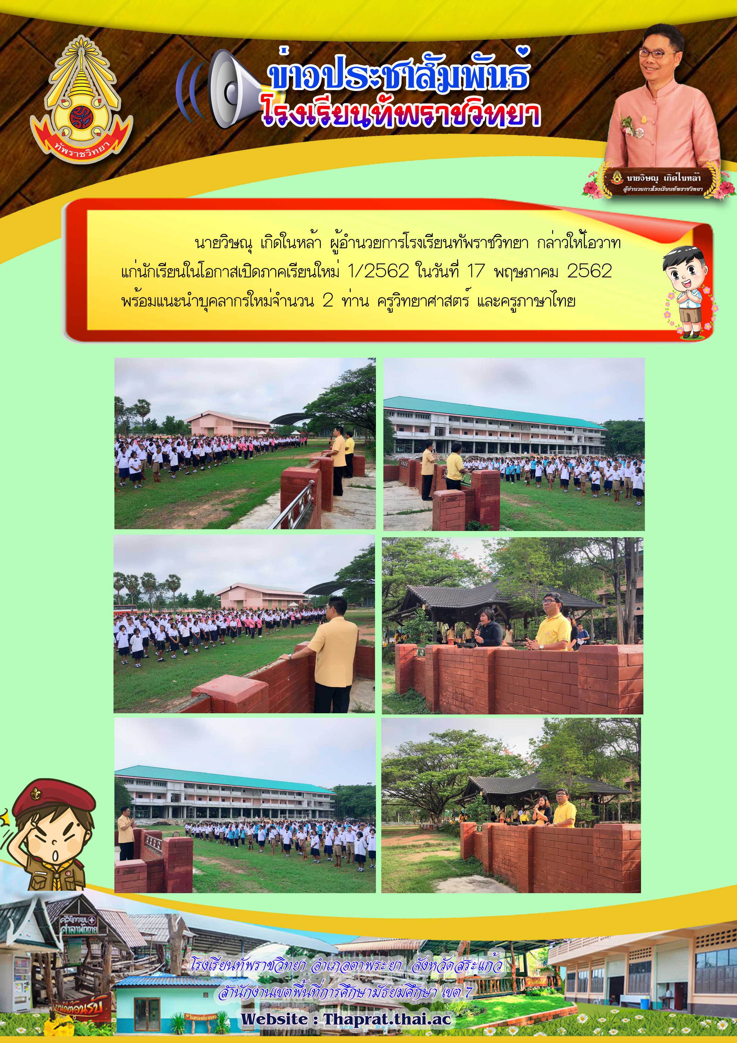 ผู้อำนวยการวิษณุ เกิดในหล้า ได้ให้โอวาทนักเรียนในวันเปิดภาคเรียนที่ 1 ปีการศึกษา 2562 พร้อมแนะนำบุคลากรใหม่