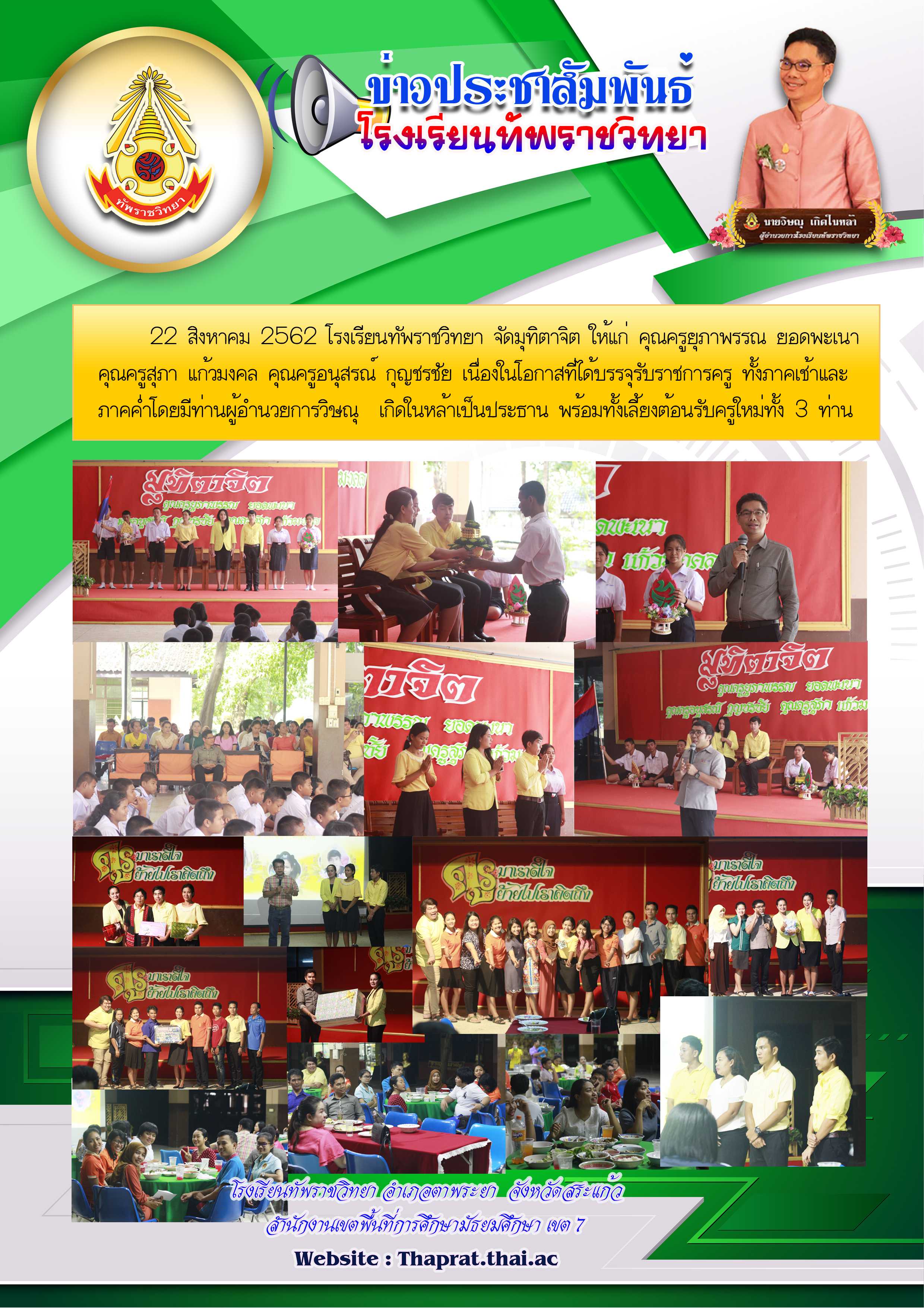ยินดีทั้งการมาและการจากลา 22 สิงหาคม 2562 โรงเรียนทัพราชวิทยา จัดงานเลี้ยงตอนรับ คุณครูชัชวัสส์ ไชยโพธิ์ คุณครูพชรพล ธรรมมา และคุณครูสุมาลี ฤทธิสมิต และเลี้ยงส่งคุณครูสุภาแก้วมงคล คุณครูยุภาพรรณ ยอดพะ