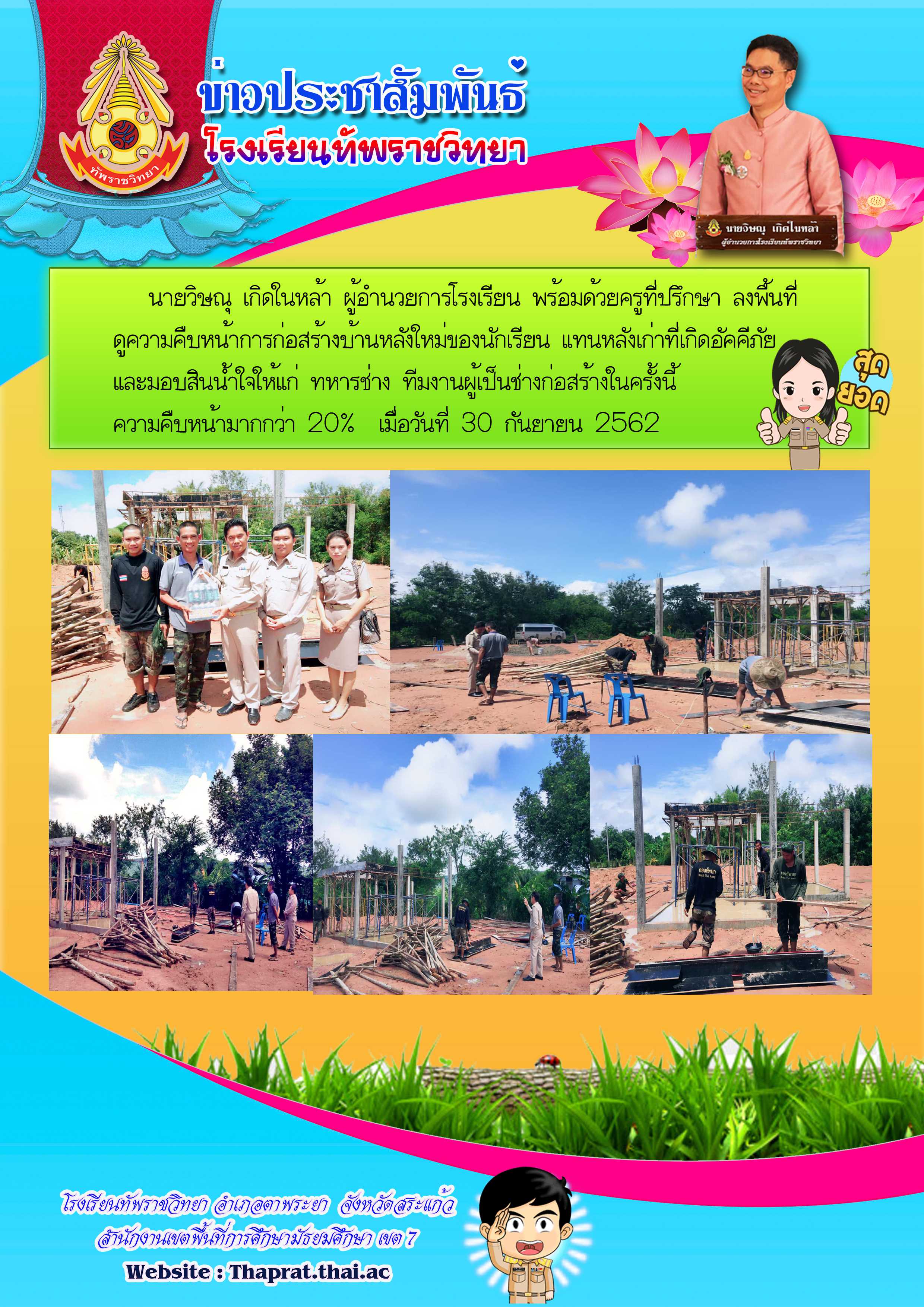 นายวิษณุ เกิดในหล้า ผู้อำนวยการโรงเรียน พร้อมด้วยครูที่ปรึกษา ลงพื้นที่ดูความคืบหน้าการก่อสร้างบ้านหลังใหม่ของนักเรียน แทนหลังเก่าที่เกิดอัคคีภัย และมอบสินน้ำใจให้แก่ ทหารช่าง ทีมงานผู้เป็นช่างก่อสร้า