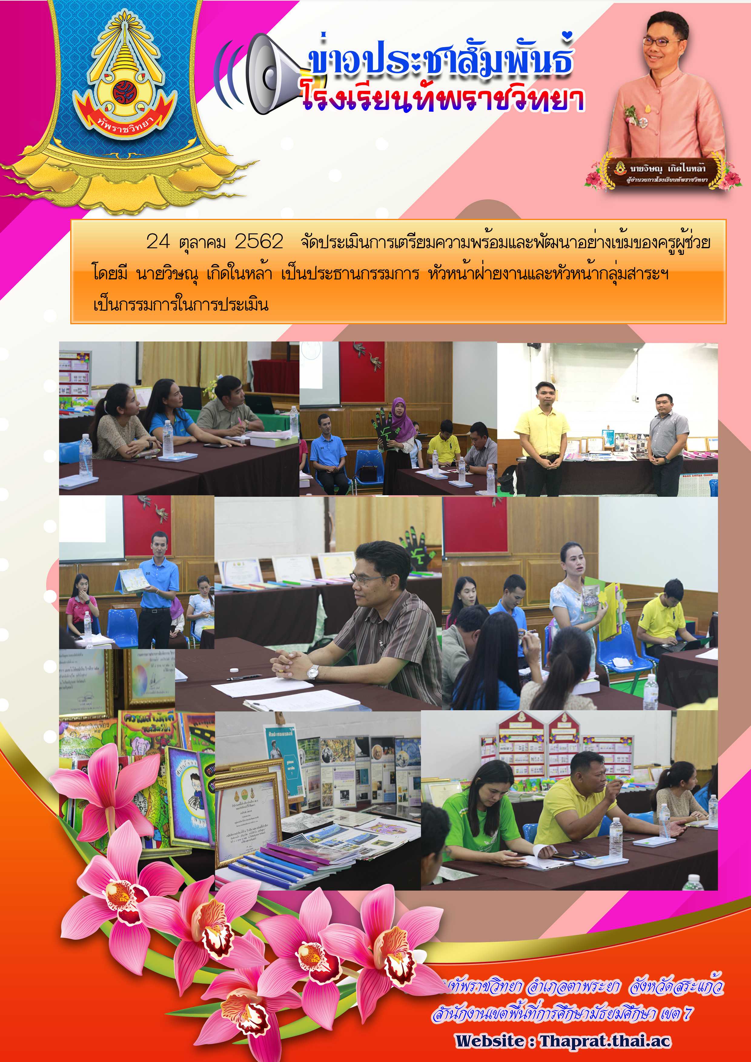 24 ตุลาคม 2562 จัดประเมินการเตรียมความพร้อมและพัฒนาอย่างเข้มของครูผู้ช่วย โดยมี นายวิษณุ เกิดในหล้า เป็นประธานกรรมการ หัวหน้าฝ่ายงานและหัวหน้ากลุ่มสาระฯ เป็นกรรมการในการประเมิน
