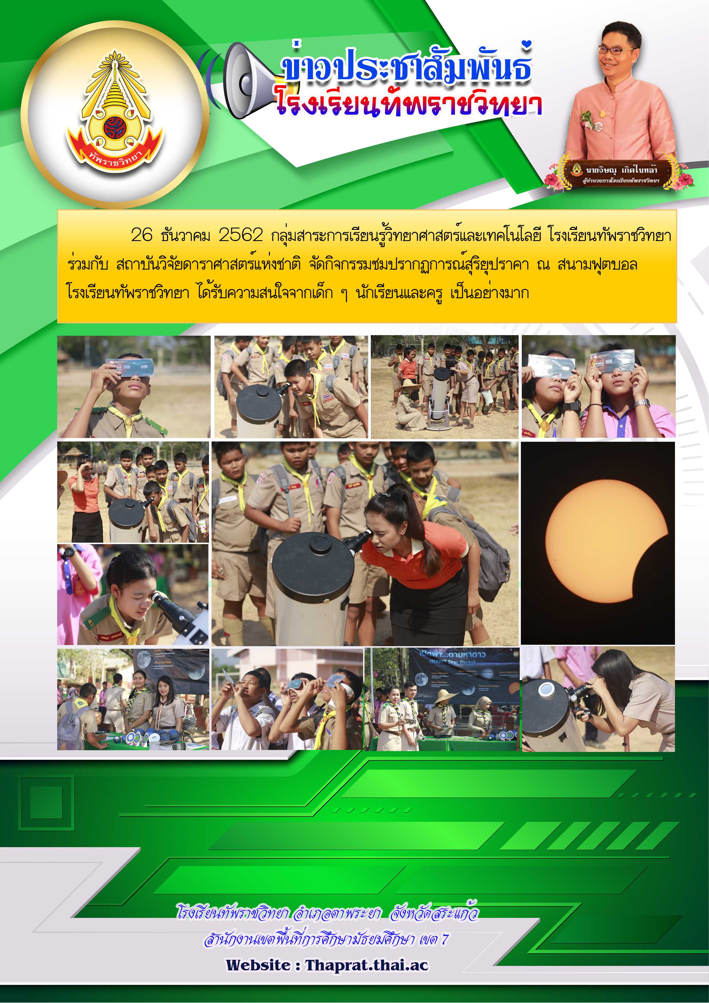 26 ธันวาคม 2562 กลุ่มสาระการเรียนรู้วิทยาศาสตร์และเทคโนโลยี โรงเรียนทัพราชวิทยา ร่วมกับ สถาบันวิจัยดาราศาสตร์แห่งชาติ จัดกิจกรรมชมปรากฏการณ์สุริยุปราคา ณ สนามฟุตบอลโรงเรียนทัพราชวิทยา ได้รับความสนใจจา