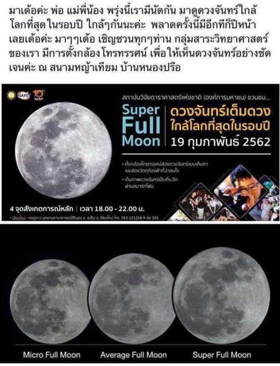 กลุ่มสาระวิทยาศาสตร์ และเทคโนโลยี ได้จัดกิจกรรม ชมปรากฎการณ์ดวงจันทร์ใกล้โลกที่สุดในรอบปี ให้กับชุมชน และผู้ที่สนใจ ณ สนามหญ้าเทียมบ้านหนองปรือ 19 กุมภาพันธ์ 2562