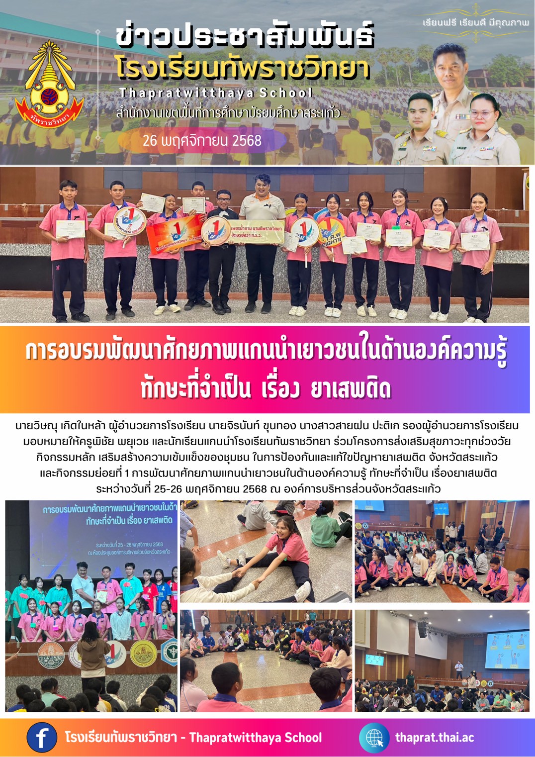 การอบรมพัฒนาศักยภาพแกนนำเยาวชนในด้านองค์ความรู้ ทักษะที่จำเป็น เรื่อง ยาเสพติด